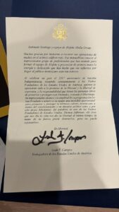 Durante el documento, la representante diplomática vinculó su mensaje con la conmemoración del 250 aniversario de la independencia de los Estados Unidos, recordando el pensamiento de los padres fundadores de esa nación sobre la libertad y la libertad de expresión.